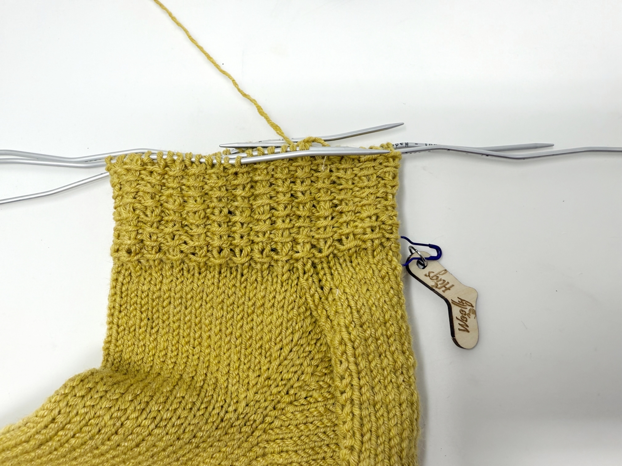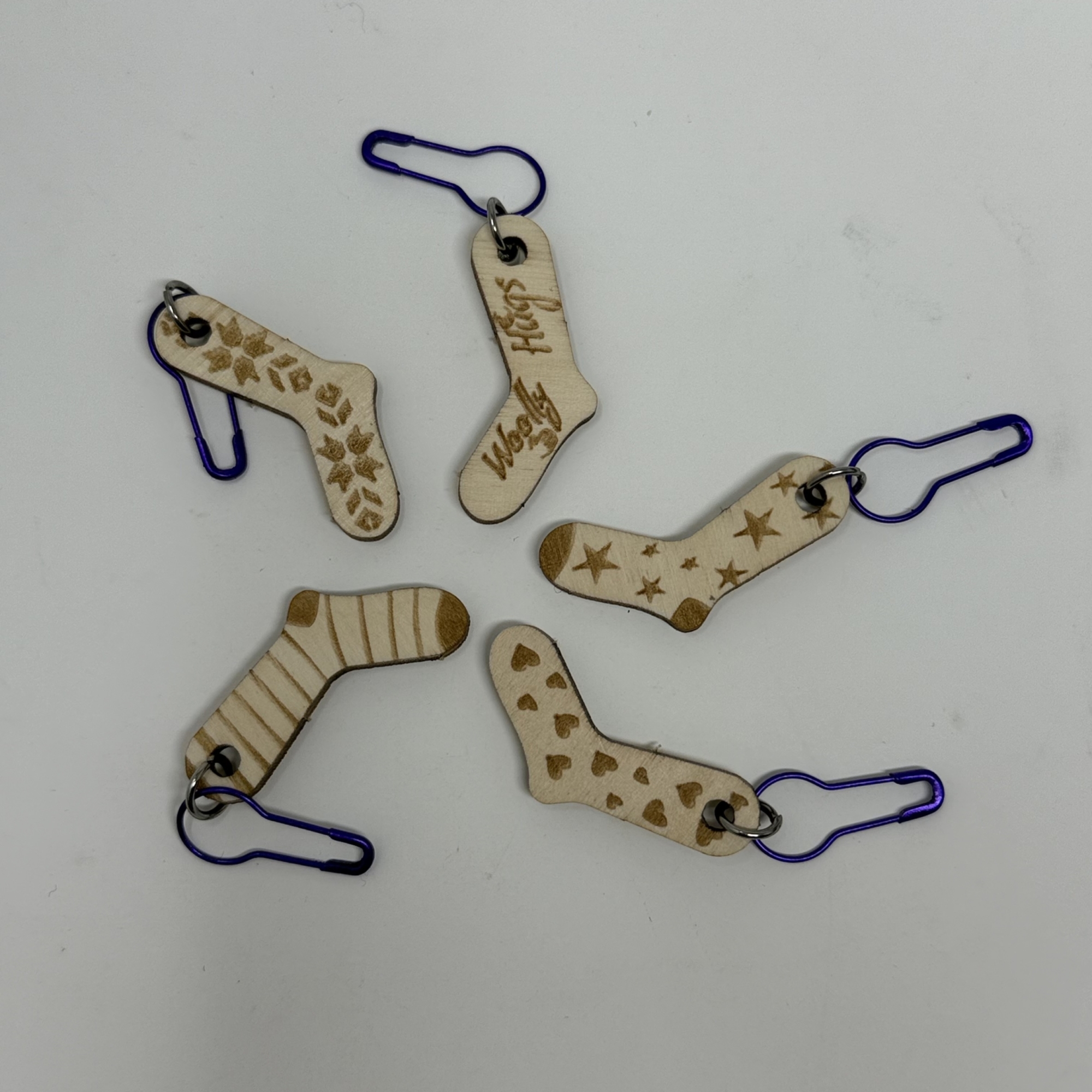 5 Maschenmarkierer in Sockenform. 4 Söckchen haben verschiedene Muster, 1 Söckchen trägt das Logo „Woolly Hugs“.